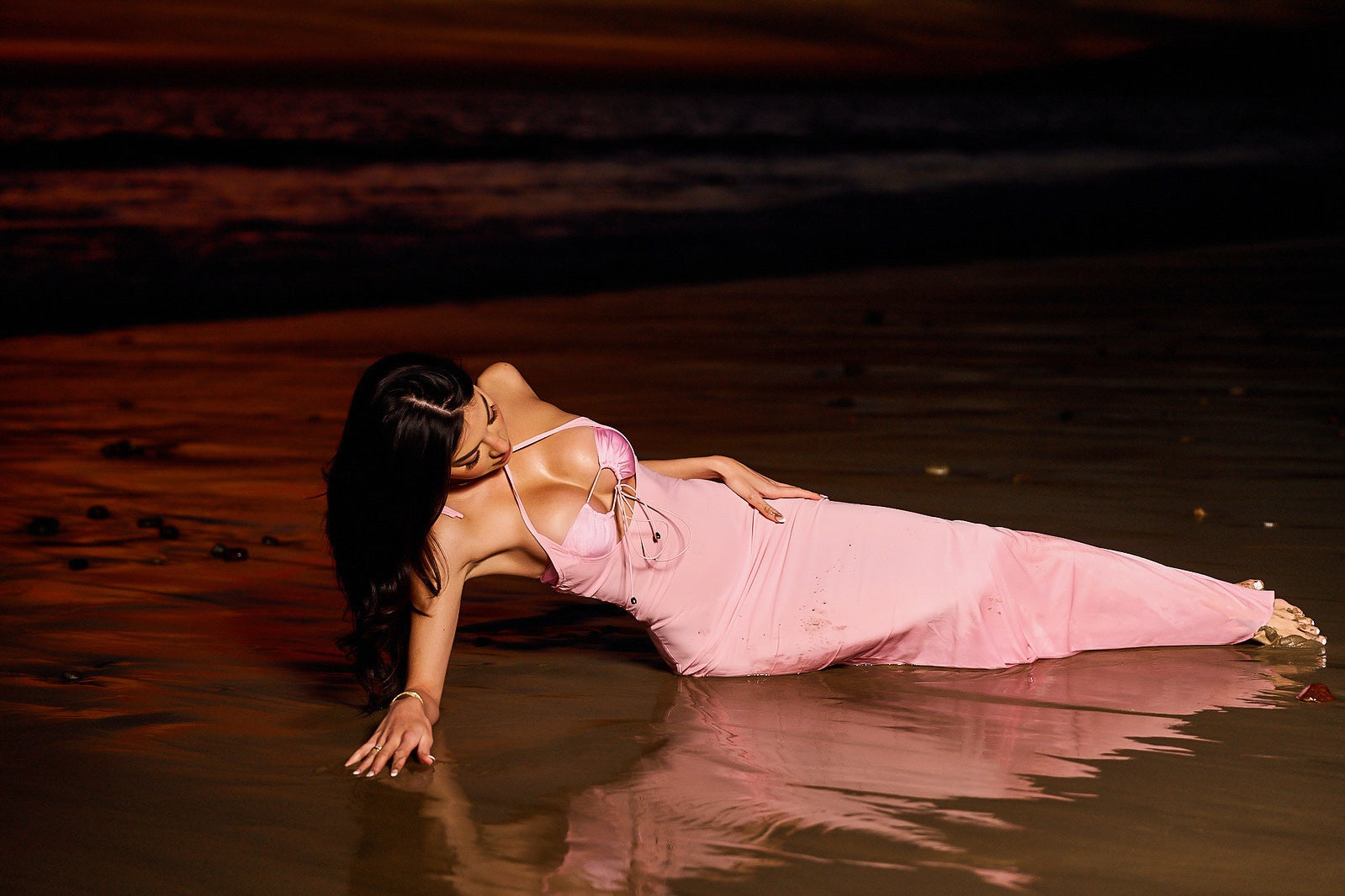 Complementing the Sunkissed bikini set is a mesmerizing tight maxi chiffon dress, epitomizing beachside grace. With a subtle yet seductive silhouette, this coverup moves fluidly with every step, ensuring you captivate attention during evening beach strolls or seaside dinners.